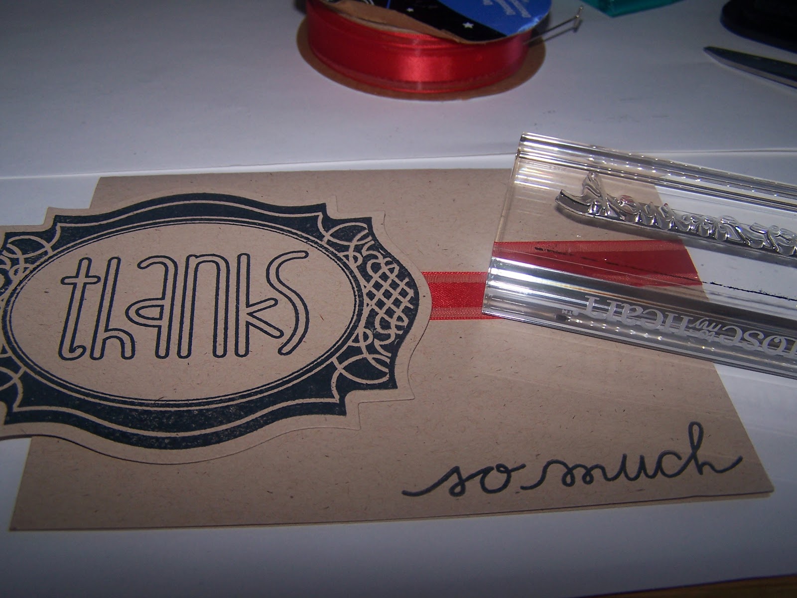 I've created a Thank you using an 8.5 x 11 sheet of Kraft paper cut in half and stamped a Thanks using a Lovely Labels stamp from THE CRAFT'S MEOW and the sentiment is from PAPER SMOOCHES Chit Chat set.. After Stamping both in Black, I used a Spellbinder's Labels 18 to cut the image out.. This was all done in 3 easy steps. I added the red ribbon for a splash of color, mounted the die cut image with mounting tape and the card was complete.
